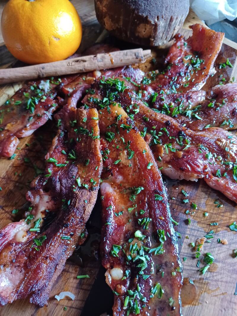 Traduction approximative modifiée à partir de Google trad : Prenez un morceau de lard salé avec du gras et du maigre, coupez-le en tranches et placez-les dans la poêle pour les faire cuire, sans les laisser cuire trop longtemps. Ensuite, mettez-les dans un plat et soupoudrer d'un peu de sucre, d'un peu de cannelle et d'un peu de persil haché. Vous pouvez le préparer de la même manière que la summata (un type de charcuterie italien qui n'existe plus) ou le presutto (un morceau de jambon séché), en ajoutant à la place du vinaigre du jus d'oranges ou de citrons, comme vous voulez, et cela le rendra plus goûteux.