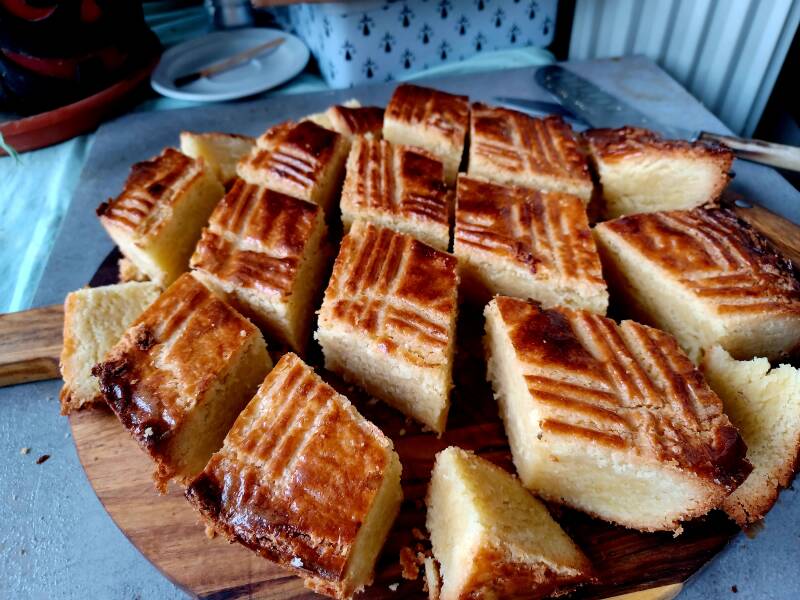 - Laisser au moins tiédir avant de découper en parts triangulaires classiques ou, plus traditionnel paraît-il, en losanges en suivant les croisillons.