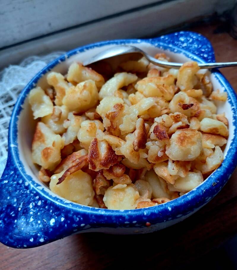 En tout cas pour avoir essayé, la version salée fonctionne en effet très bien, mais plutôt avec de la farine de froment et en remplaçant le lait par de l'eau. Avec le sarrasin, ça s'effrite un peu trop et c'est globalement moins plaisant. Autant faire du gwinizh-du. Pour le froment par contre, ça peut faire un super accompagnement pour un plat et ça ressemble aux knepfles alsaciennes. Et pas besoin de remplacer le sucre par du sel, le beurre salé suffit très bien à assaisonner.