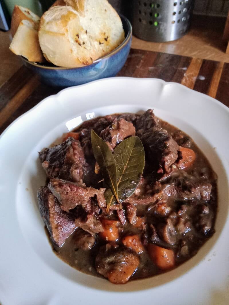 La petite difficulté de la recette tient du choix de la viande puis de la réussite de la cuisson. Si vous avez de la chance comme moi, même de la "viande à braiser" de grande surface peut très bien faire l'affaire. Il faut juste vérifier qu'elle ait l'air assez gélatineuse mais pas trop et qu'elle soit bien persillé (dans le sens de gras intramusculaire hein, pas de persil). Et surtout, surtout, on ne se précipite pas pour faire cuire. Ce n'est absolument pas un plat à faire un soir en rentrant du boulot. Ça demande une cuisson toute douce, à petit feu et pendant des heures. Par contre, c'est meilleur réchauffé, alors faire ça un week-end pour un lundi soir, c'est parfait. Il reste juste à faire le soir même du pain grillé pour accompagner et, bien sûr, un vin de bourgogne (votre vin/boisson préférée fera l'affaire, je dirai rien promis).