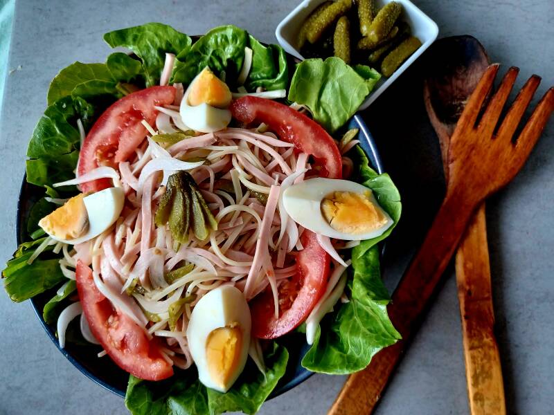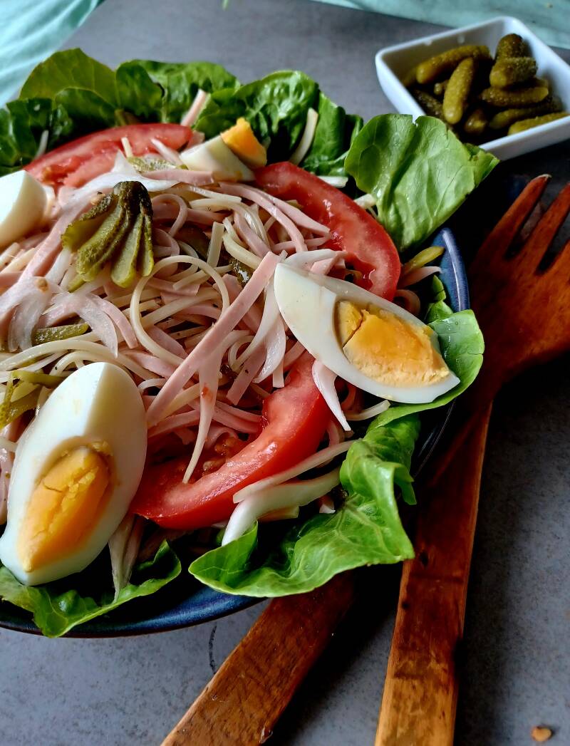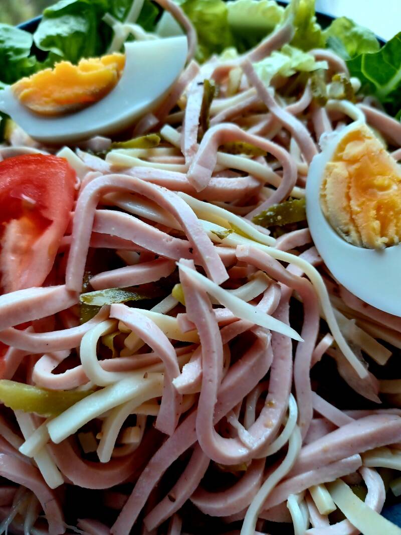 Il y a plusieurs versions globalement mais je trouve vraiment l'association de julienne de cornichons, fromage et saucisse bien équilibrée et pour moi, la salade suffit, pas besoin de patates.