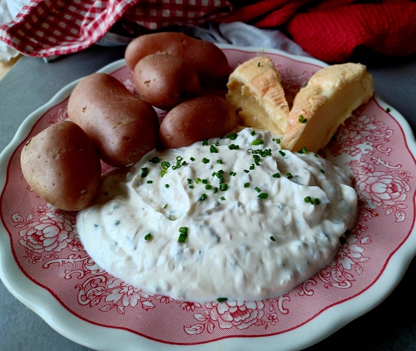 - Émincer finement les échalotes, l'ail et la ciboulette. Les mélanger au fromage blanc avec du sel et du poivre au goût pour terminer le bibbalakaas.