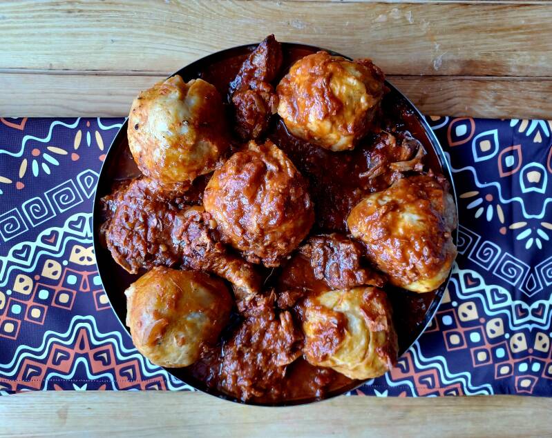 Mais assez disserté sur les pains vapeurs. Si le widjila est un pain cuit à la vapeur dans un couscoussier, au dessus de la sauce avec laquelle il est consommé, le tukasu, lui aussi de Tombouctou, utilise le même principe mais fait cuire les boules de pâte directement sur la sauce. Et oui, le pain gonfle très bien comme ça, pas d'inquiétude. En plus, ça simplifie la préparation et ça lui donne une texture légèrement différente puisqu'il reste à moitié humide en surface. Il s'imprègne aussi davantage des saveurs à la dégustation je trouve. Dans les recettes on conseille régulièrement de faire une seconde levée de pâte une fois sous forme de boule, mais personnellement elles finissent toujours par perdre leur forme en gonflant, alors j'aurai tendance à zapper cette étape. Une fois la pâte ayant doublé voir triplé de volume, j'en fais des boules que je met directement dans la marmite.