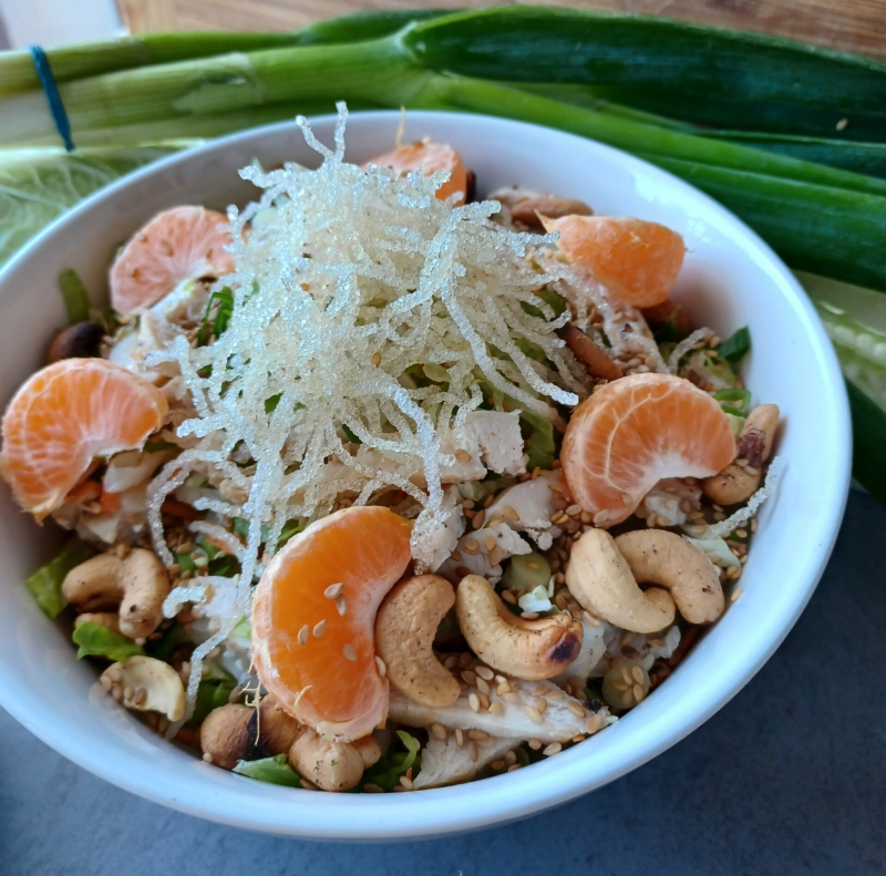 Alors que certaines recettes de cuisine fusion ont des bases communes assez évidentes avec leur cuisine d'origine, ce n'est pas le cas de cette salade. En effet, à ma connaissance et mêle si Wikipedia a du mal à se prononcer, aucune recette de laitue crue en salade n'existe dans le fourmillement de plats pourtant quasi infini de la cuisine chinoise. On pourra certes reconnaître l'utilisation de graines de sésame ou de noix et autres arachides comme très présentes dans la cuisine Est-asiatique, que ce soit pour des plats chauds ou froids. La sauce soja, le blanc de poulet, le gingembre et les oignons verts, constitutifs du plat, sont aussi très utilisés en cuisine chinoise mais rarement si ce n'est jamais de cette façon.