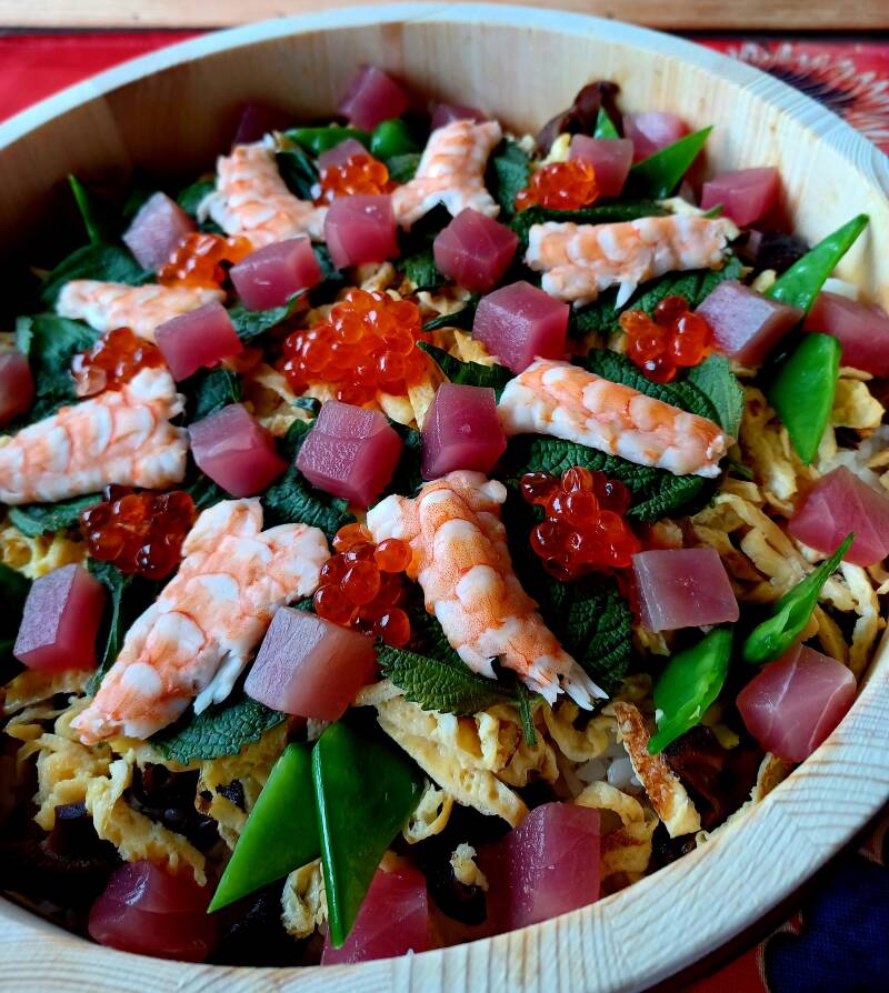 Il est réalisé lors d'Hina Matsuri, la fête des petites filles au Japon qui a lieu en février, et il est souvent richement décoré avec les ingrédients qui le composent. Le poisson cru n'y a qu'une part minime, voir inexistante, et les composants les plus courants incluent du kinshi tamago (de fines lamelles d'omelette), du ikura (des œufs de saumon), des crevettes, des pois mange tout et des champignons shiitake confits. Et très franchement, pour n'avoir essayé qu'une fois, c'est très joli mais ce n'est pas trop mon truc. Peut être que je l'avais mal réalisé ou qu'il me manquait des ingrédients plus intéressants. En tout cas, pour l'instant, je me contente comme tout le monde du chirashi de Tokyo, voir du "californien".