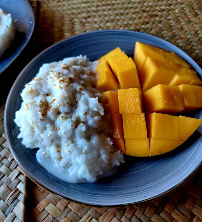 - Servir dans une assiette ou directement sur une feuille de bananier la mangue et le riz chaud recouvert du lait de coco épaissit et des graines de sésame.