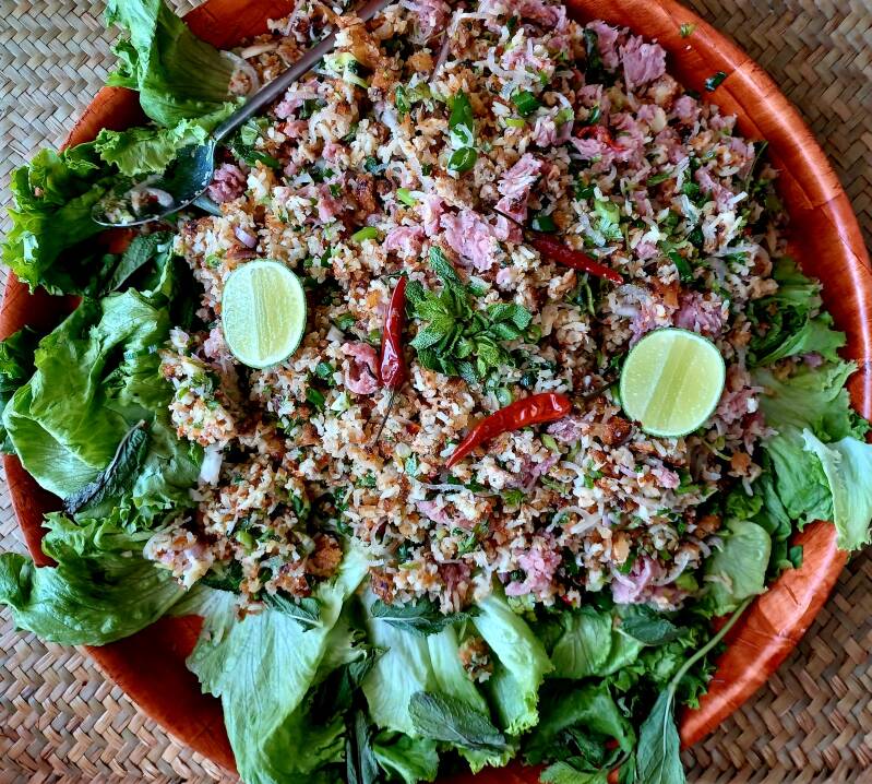 On peut le rapprocher du larb laotien pour ce qui est de l'utilisation de viande en salade avec des herbes, mais je ne connais aucun autre plat qui utilise le nem chua cru. Le seul type de plat à ma connaissance à l'utiliser cuit, c'est du riz sauté.