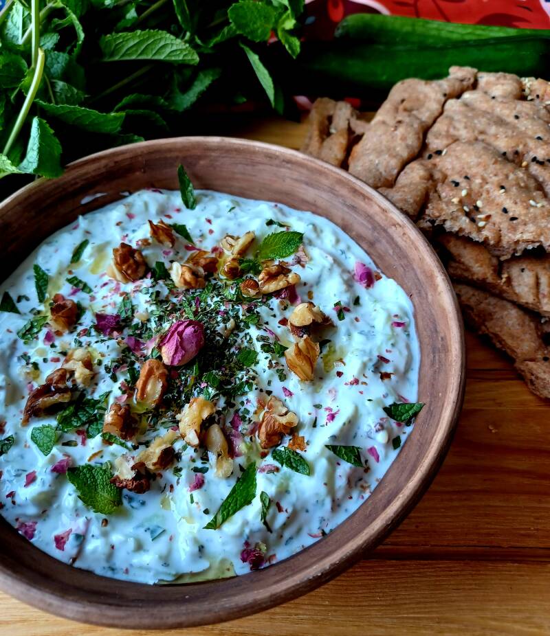 Contrairement à ses cousins, la particularité iranienne est d'ajouter parfois des boutons de rose, parfois des raisins secs. Mais il existe une version plus luxueuse que les autres qui ajoute tout ça en même temps. Et c'est du génie. Noix torréfiées pour la saveur et le croquant, menthe fraiche et séchée pour leurs différents arômes, ail pour relever le goût et rose et raisins secs pour le sucré. On laisse tout ça mariner la nuit (sauf les noix dont on veut conserver le croquant au maximum) et c'est une explosion gustative avec...du yaourt et du concombre comme base.