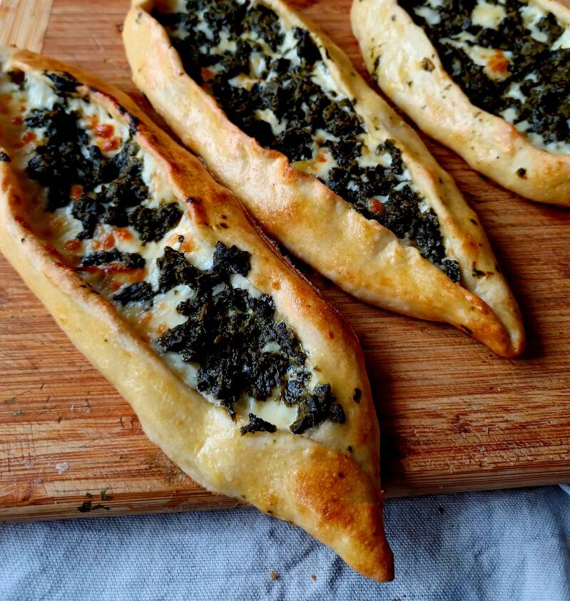 Toujours est-il que la pâte du içli pide est plus plate que le pide ekmeği puisqu'on l’étale au rouleau à pâtisserie avant de former les très reconnaissables "barques" ou fuseaux en repliant les bords par dessus la garniture. Et oui, les turcs faisaient des "croûtes au fromage" avant que les américains le fasse sur leurs pizzas. La forme est quelquefois ronde comme une pizza mais c'est plus rare et moins typique. La pâte est souvent à base de lait ou, ce que je préfère, à base de yaourt.